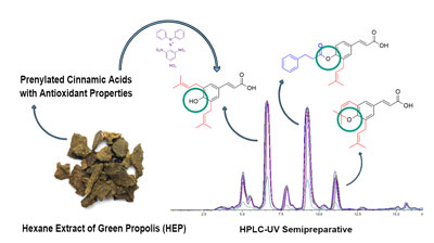 HPLC-UV (semi-preparative) was used to isolate the main prenylated substances from Brazilian green propolis and DPPH scavenging was used to quantify their antioxidant properties