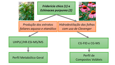This work investigated the profile of volatile compounds and other F. chica and E. purpurea metabolites through phytochemical characterization methods