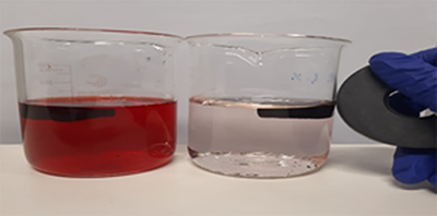 A magnetic and floating composite capable of adsorbing organic contaminants in an aqueous medium.