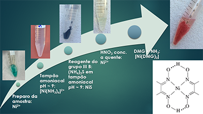 This work proposed schemes for cation separation and identification of nickel in costume jewelry (earrings). Nickel is a potentially toxic metal; its identification in two samples was based on a chemical reaction that occurs between Ni2+ and dimethylglyoxime, with formation of a red, insoluble complex.