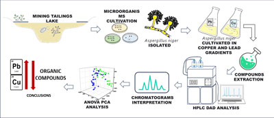 Analysis of compounds produced by Aspergillus niger isolated from a mining waste pond, revealed interference of Copper and Lead in the fungus metabolism, related to the concentration and not the type of metal.